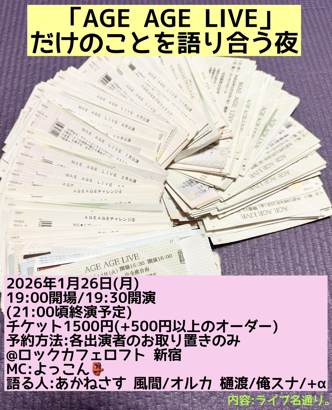 SCHEDULE 2026 01 26 Monday 「AGE AGE LIVE」だけのことを語り合う夜 OPEN 19:00 - START 19:30 Tweet MC:よっこん 出演者:あかねさす 風間/オルカ 樋渡/俺スナ+α TICKETご予約方法:各出演者またはMLクリエーション公式LINEまで ご予約はこちらから☜ click! Share
