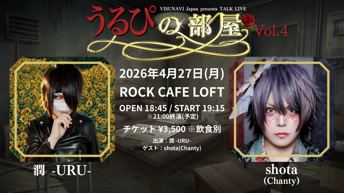 SCHEDULE 2026 04 27 Monday VISUNAVI Japan presents うるぴの部屋 vol.4 Tweet TICKET[抽選販売チケット] ●整理番号チケット¥3,500 ※共に飲食代別/要1オーダー¥500以上 ※お客様都合によるチケットキャンセルは受け付けておりません。 ※チケットはLivePocketにて/()の22:00から/()23:59まで受付! ︎︎購入はこちらから☜ click! Share