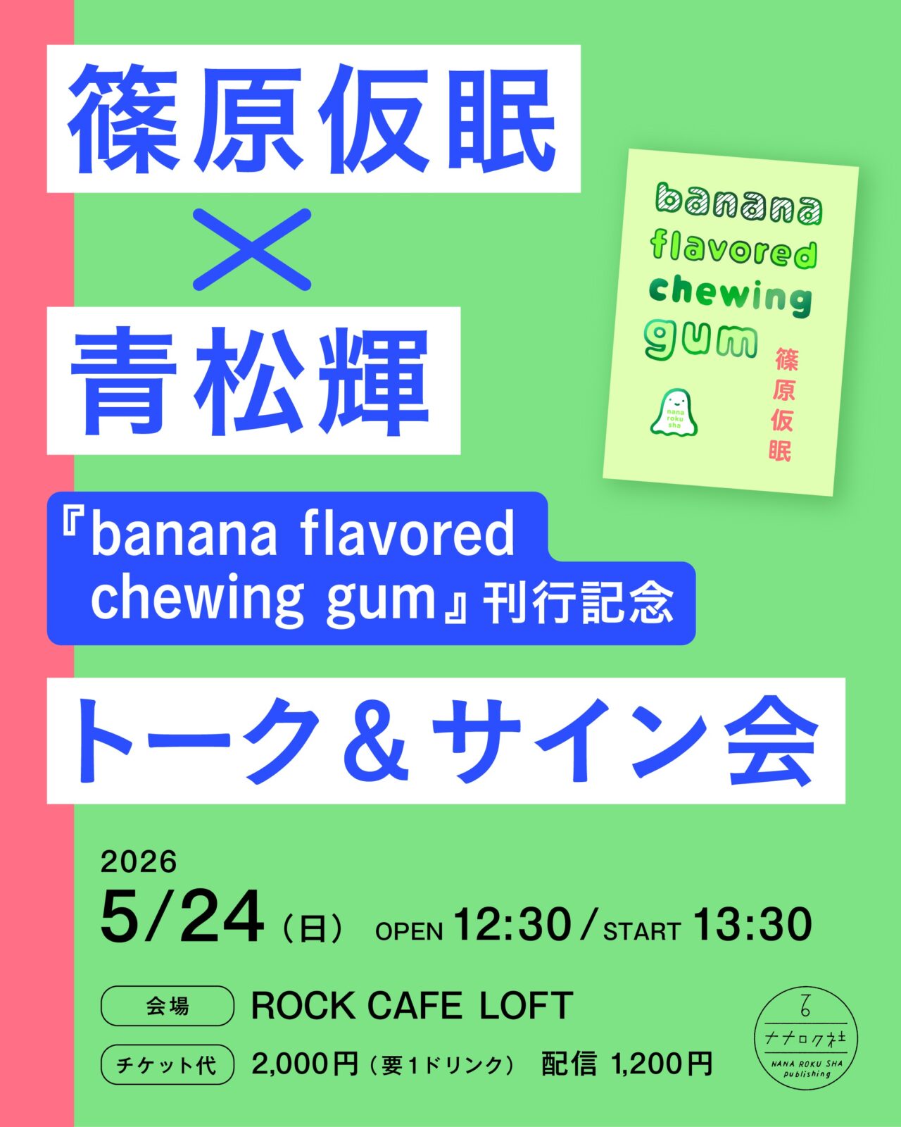 岡野大嗣 選として刊行が決まった篠原仮眠の第1歌集『banana flavored chewing gum』。