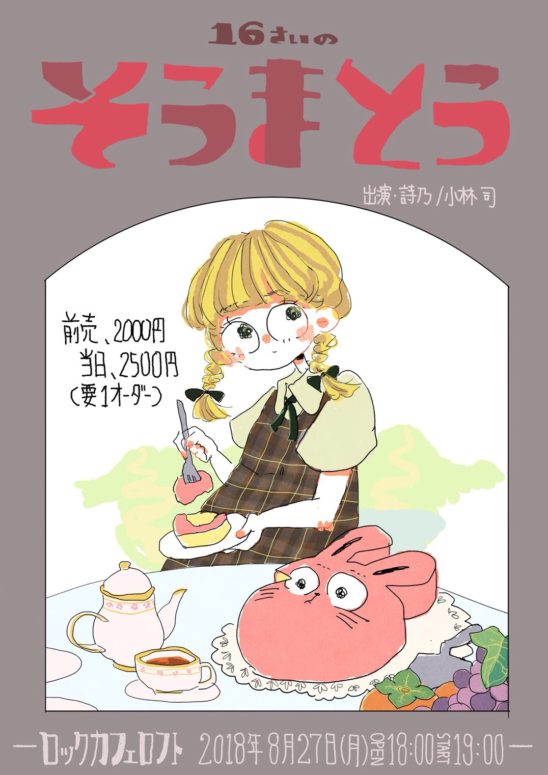 SCHEDULE 2018 08 27 Monday 16さいのそうまとう OPEN 18:00 - START 19:00 Tweet 【出演】詩乃、小林司 TICKET前売¥2,000/当日¥2,500(+要1オーダー) 前売り券はe+にて8月15日(水)12時より発売開始! ※当日券あり。お待ちしております。 Share