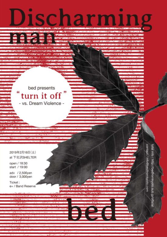 SCHEDULE 2019 02 16 Saturday bed presents”turn it off〜Vs.Dream Violence〜” OPEN 18:30 - START 19:00 Tweet Discharming man bed TICKETADV¥2500 / DOOR¥3000 【発売日】 11/13〜e+・BAND予約 Share