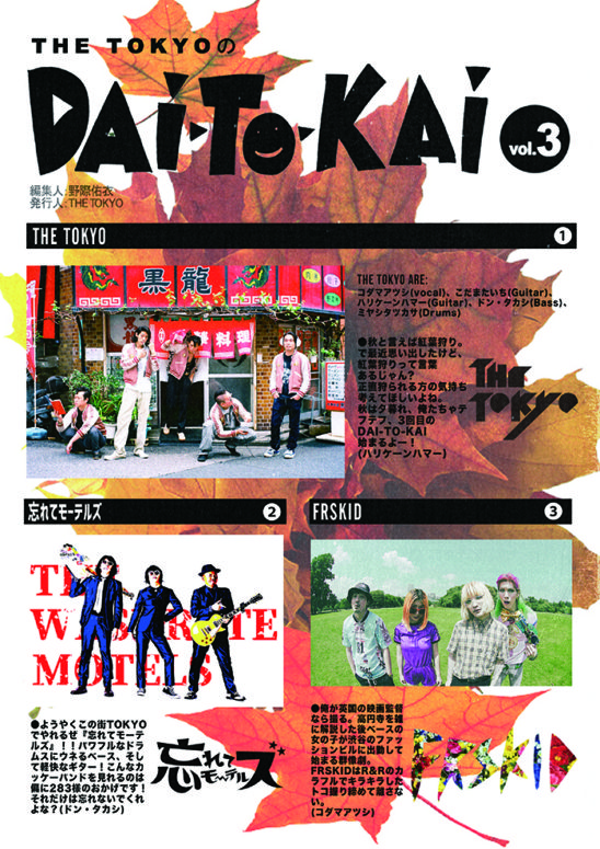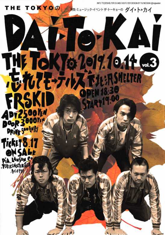 SCHEDULE 2019 10 14 Monday THE TOKYOのDAI-TO-KAI 3 OPEN 18:30 - START 19:00 Tweet THE TOKYO 忘れてモーテルズ FRSKID TICKETADV¥2500 / DOOR¥3000 【発売日】 8/17〜ぴあ(P:161-989)・LAWSON(L:76619)・e+・SHELTER店頭 Share