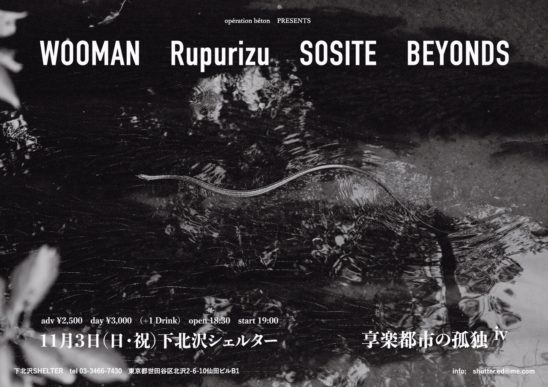 SCHEDULE 2019 11 03 Sunday “享楽都市の孤独 iv” OPEN 18:30 - START 19:00 Tweet WOOMAN Rupurizu SOSITE BEYONDS TICKETADV¥2500 / DOOR¥3000 【発売日】 8/25〜e+・SHELTER店頭・BAND予約 Share