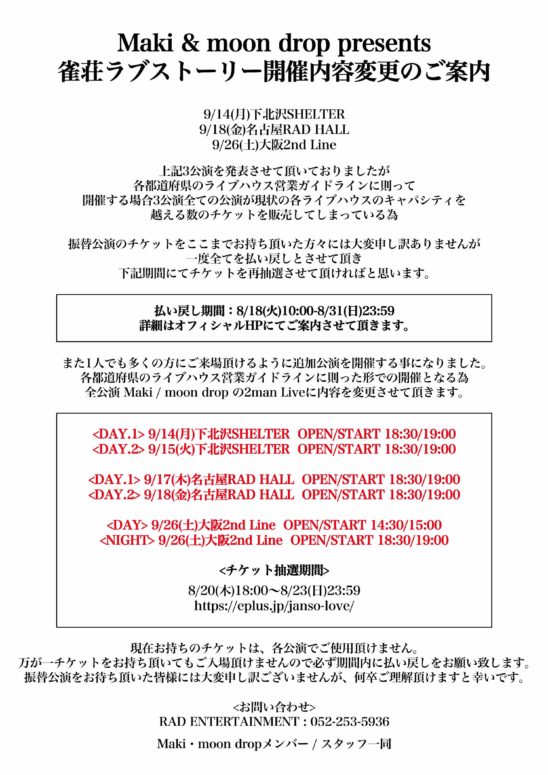SCHEDULE 2020 09 15 Tuesday Maki & moon drop presents 「雀荘ラブストーリー」 – 索子編 – OPEN 18:30 - START 19:00 Tweet Maki / moon drop TICKETADV¥2500 払い戻し・再抽選・一般等につきましては 各オフィシャルサイトまで http://www.maki-official.com https://moondrop-mie.jimdofree.com Share