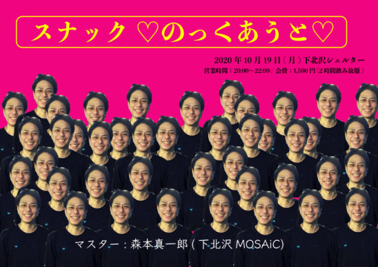 SCHEDULE 2020 10 19 Monday 【BAR TIME】『スナック ♡のっくあうと♡』 Tweet マスター森本真一郎(下北沢MOSAiC) 営業時間:20:00〜22:00 会費:¥1500(2h飲み放題/持ち込みおつまみ歓迎) Share