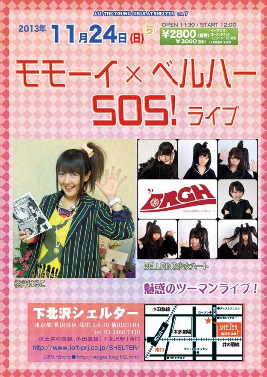 SCHEDULE 2013 11 24 Sunday DAY EVENT モモーイ×ベルハー SOS!ライブ OPEN 11:30 - START 12:00 Tweet 桃井はるこ BELLRING少女ハート TICKETADV¥2800 / DOOR¥3000 【発売日】 10/18〜ローソンチケット(Lコード:78189)・e+・SHELTER Share