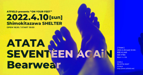 SCHEDULE 2022 04 10 Sunday On Your Feet OPEN 18:30 - START 19:00 Tweet ATATA SEVENTEEN AGAiN Bearwear TICKETADV¥3000 / DOOR¥未定 【発売日】 2/26〜e+ INFO:03-5712-5227 (エイティーフィールド) http://www.atfield.net/ Share