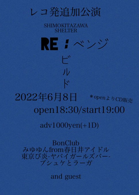 SCHEDULE 2022 06 08 Wednesday Re:ビルド8「Re:ベンジ-レコ発追加公演-」 OPEN 18:30 - START 19:00 Tweet BonClub みゆゆんfrom春日井アイドル 東京ぴ炎-ヤバイガールズバー- プシュケとラーガ and guest TICKETADV¥1000 / DOOR¥未定 【発売日】 運営予約 Share