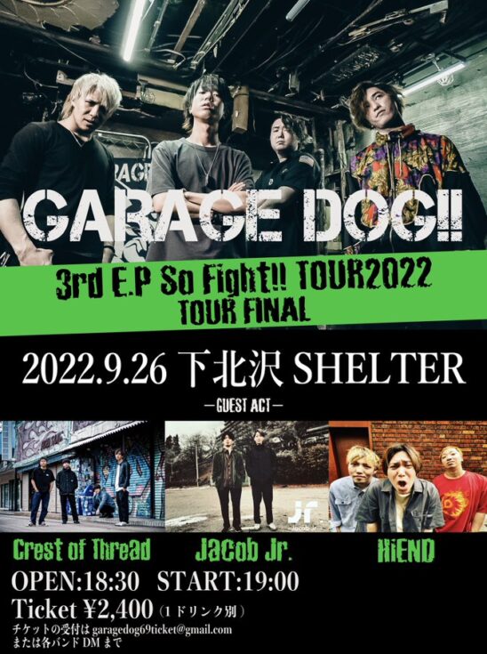 SCHEDULE 2022 09 26 Monday GARAGE DOG!! So Fight!! TOUR FINAL OPEN 18:30 - START 19:00 Tweet GARAGE DOG!! Jacob Jr. Crest of Thread HiEND TICKETADV¥2400 / DOOR¥未定 【発売日】 BAND予約 Share