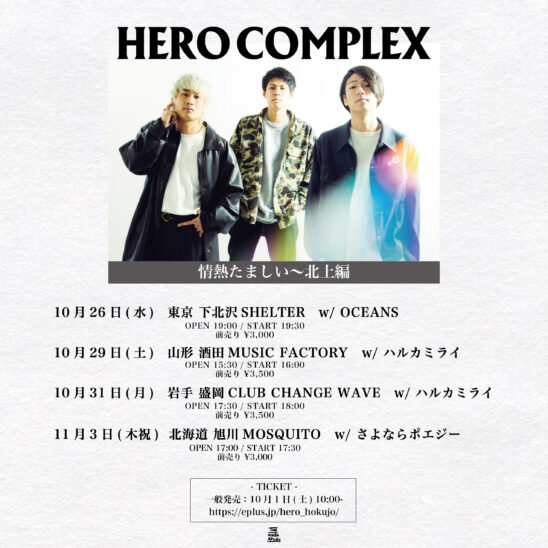 SCHEDULE 2022 10 26 Wednesday HERO COMPLEX “情熱たましい〜北上編” OPEN 19:00 - START 19:30 Tweet HERO COMPLEX OCEANS TICKETADV¥3000 / DOOR¥3500 【発売日】 10/1〜e+ https://eplus.jp/hero_hokujo/ Share