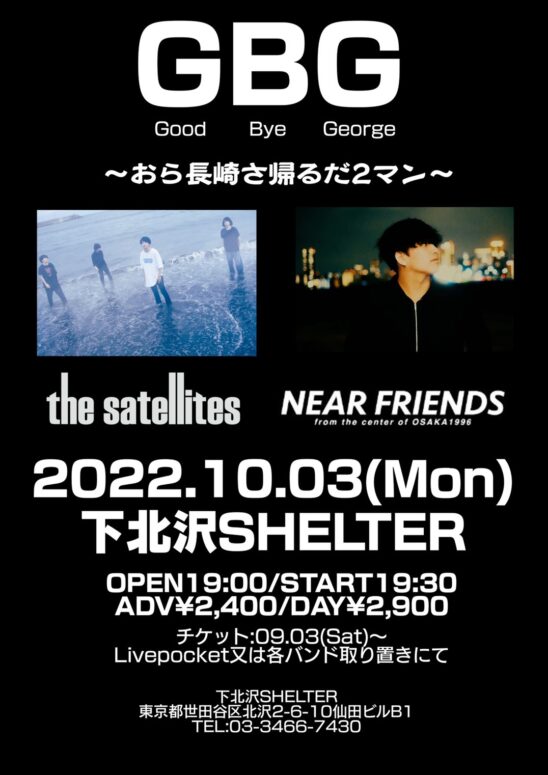 SCHEDULE 2022 10 03 Monday GBG〜おら長崎さ帰るだ2マン〜 OPEN 19:00 - START 19:30 Tweet the satellites ニアフレンズ TICKETADV¥2400 / DOOR¥2900 【発売日】 9/3〜Livepocket・各BAND予約 https://t.livepocket.jp/e/sddhg Share