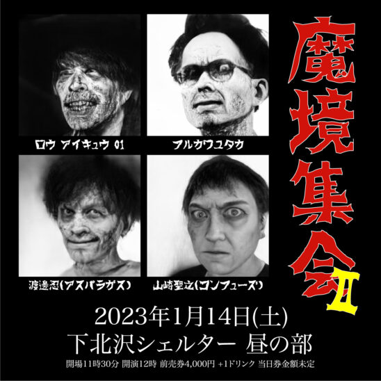 SCHEDULE 2023 01 14 Saturday DAY EVENT 「魔境集会Ⅱ」 OPEN 11:30 - START 12:00 Tweet LOW IQ 01 フルカワユタカ 山﨑聖之(CONFVSE) 渡邊忍(ASPARAGUS) TICKETADV¥4000 / DOOR¥未定 【発売日】 THANK YOU!! SOLD OUT!! ※全自由(椅子席+スタンディング) Share
