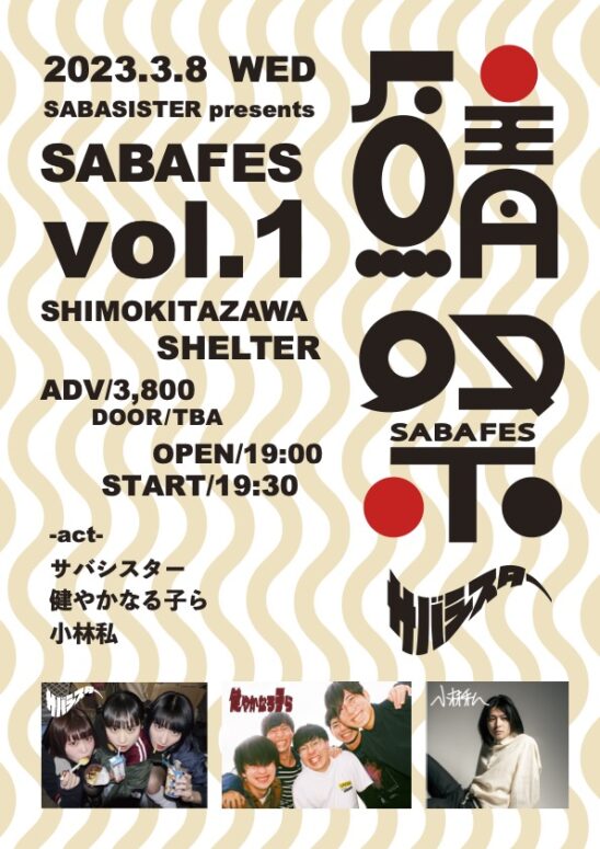 SCHEDULE 2023 03 08 Wednesday サバフェス vol.1 OPEN 19:00 - START 19:30 Tweet サバシスター 健やかなる子ら 小林私 TICKETTHANK YOU! SOLD OUT!! ADV¥3800 【発売日】 Livepocket 先行抽選受付:1/3 20:00〜1/9 23:59 一般発売:1/15 10:00 https://t.livepocket.jp/e/sabafes_2023 Share