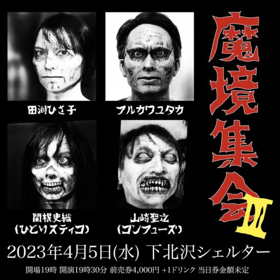 SCHEDULE 2023 04 05 Wednesday 魔境集会Ⅲ OPEN 19:00 - START 19:30 Tweet フルカワユタカ 山﨑聖之(CONFVSE) 田渕ひさ子 関根史織(ひとりstico) TICKETADV¥4000 / DOOR¥4500 【発売日】 THANK YOU!! SOLD OUT!! Share
