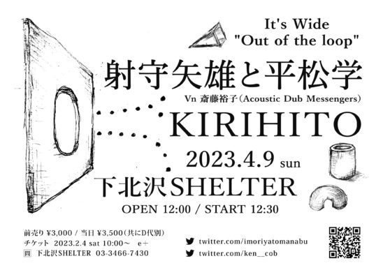 SCHEDULE 2023 04 09 Sunday DAY EVENT 『It’s Wide “Out of the loop”』 OPEN 12:00 - START 12:30 Tweet 射守矢雄と平松学<Vn.斎藤裕子(Acoustic Dub Messengers)> KIRIHITO TICKETADV¥3000 / DOOR¥3500 【発売日】 2/4〜e+ Share