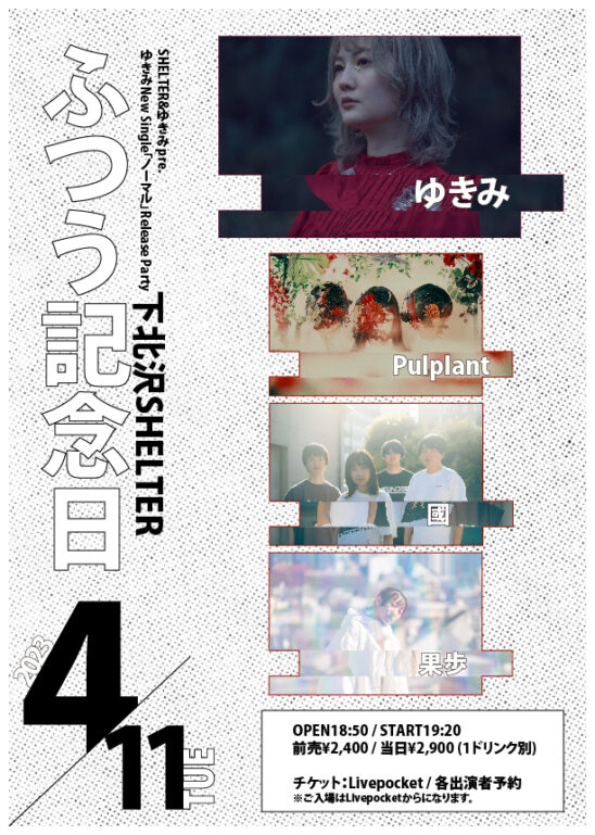 SCHEDULE 2023 04 11 Tuesday SHELTER&ゆきみ pre. ゆきみNew Single「ノーマル」Release Party 『ふつう記念日』 OPEN 18:50 - START 19:20 Tweet ゆきみ Pulplant 國 果歩 TICKETADV¥2400 / DOOR¥2900 【発売日】 3/1〜Livepocket・各BAND予約 https://t.livepocket.jp/e/7y20v ※ご入場はLivepocketからになります。 Share