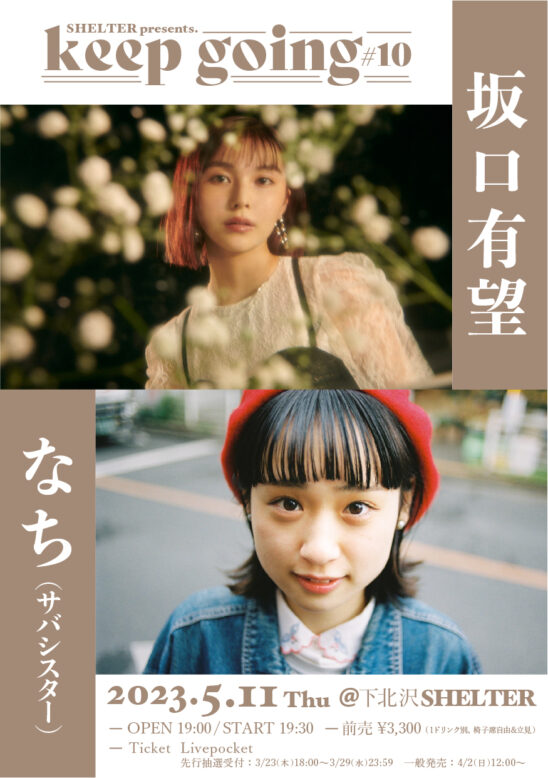 SCHEDULE 2023 05 11 Thursday SHELTER presents. “keep going” #10 OPEN 19:00 - START 19:30 Tweet 坂口有望 なち(サバシスター) TICKETTHANK YOU! SOLD OUT!! ADV¥3300 【発売日】 先行抽選:3/23 18:00〜3/29 23:59 一般:4/2 12:00〜 Livepocket https://t.livepocket.jp/e/keepgoing_10 Share