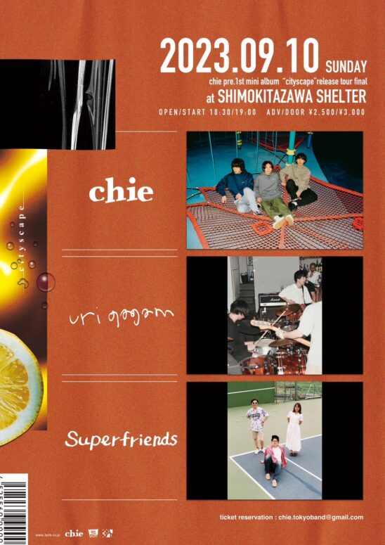 SCHEDULE 2023 09 10 Sunday chie 1st mini album “cityscape” release tour final OPEN 18:30 - START 19:00 Tweet chie Superfriends uri gagarn TICKETADV¥2500 / DOOR¥3000 【発売日】 BAND予約 Share