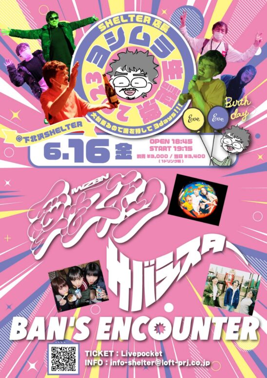 SCHEDULE 2023 06 16 Friday SHELTER店長ヨシムラ生誕祭2023 〜大台乗るので満を持して3days!!! 〜 ” Birthday Eve Eve “ OPEN 18:45 - START 19:15 Tweet 愛はズボーン サバシスター BAN’S ENCOUNTER TICKETADV¥3000 / DOOR¥3400 【発売日】 Livepocket 抽選受付:4/18(火)18:00〜4/24(月)23:59 一般発売:4/29(土)12:00〜 https://t.livepocket.jp/e/eve_eve_616 Share
