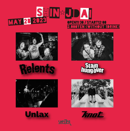 SCHEDULE 2023 05 28 Sunday DAY EVENT SHELTER presentsシン・ジダイvol.03 OPEN 11:30 - START 12:00 Tweet Relents(横浜) Stain hung over(東京) Unlax(新潟) knot(名古屋) TICKETADV¥2000 / DOOR¥2500 【発売日】 各BAND予約 Share