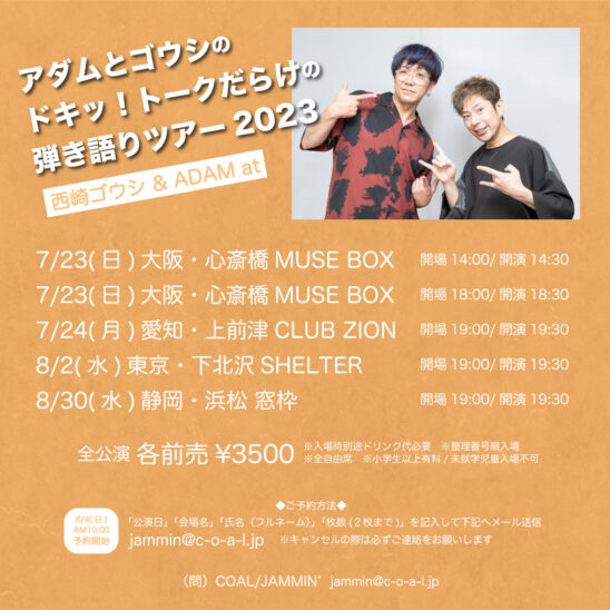 SCHEDULE 2023 08 02 Wednesday アダムとゴウシの『ドキッ!トークだらけの弾き語りツアー』2023 OPEN 19:00 - START 19:30 Tweet ADAM at 西崎ゴウシ(カルモニカ from Calmera) TICKETADV¥3500 / DOOR¥4000 【発売日】 6/4〜主催予約 jammin@c-o-a-l.jp 「公演日」「会場名」「氏名(本名フルネーム)」「枚数(2枚まで)」を記入してメール ※キャンセルの場合必ず連絡をお願いします。 Share