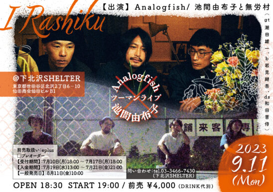 SCHEDULE 2023 09 11 Monday 9.11 I Rashiku Analogfish × 池間由布子 ツーマンライブ OPEN 18:30 - START 19:00 Tweet Analogfish 池間由布子と無労村 (g潮田雄一,b岩見継吾,ds和田晋侍) TICKETADV¥4000 / DOOR¥未定 【e+プレオーダー】 受付期間:7月10日(月)18:00~7月17日(月)18:00 【一般発売日】 8/11〜e+ Share