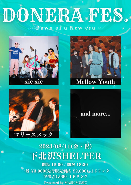SCHEDULE 2023 08 11 Friday DONERA FES OPEN 18:00 - START 18:30 Tweet xiexie Mellow Youth マリースメック and more… TICKETADV¥3000 / 学生¥1000 Share