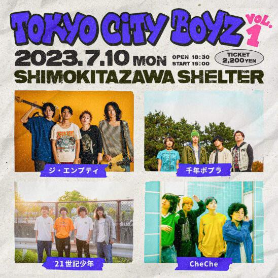 SCHEDULE 2023 07 10 Monday TOKYO CITY BOYZ VOL.1 OPEN 18:30 - START 19:00 Tweet ジ・エンプティ 千年ポプラ 21世記少年 CheChe TICKETADV¥2200 【発売日】 チケットぴあ・各BAND予約 Share