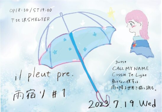 SCHEDULE 2023 07 19 Wednesday il pleut pre. 『雨宿り #1』 OPEN 18:30 - START 19:00 Tweet il pleut CALL MY NAME Cassie Te Light 負けない僕等は、雨の降る世界で猫と躍る。 TICKETADV¥2000 【発売日】 TIGET https://tiget.net/events/256820 Share
