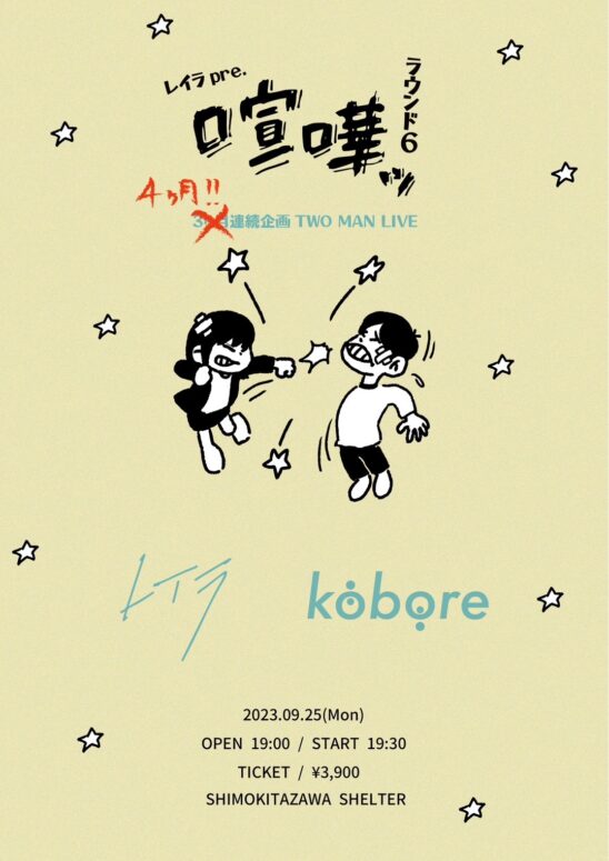 SCHEDULE 2023 09 25 Monday レイラ pre. 「喧嘩 round6」 OPEN 19:00 - START 19:30 Tweet レイラ kobore TICKETADV¥3900 【発売日】 e + Share