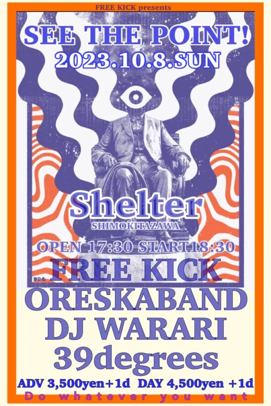 SCHEDULE 2023 10 08 Sunday FREE KICKpre “SEE THE POINT! SP EDITION” OPEN 17:30 - START 18:30 Tweet FREE KICK ORESKABAND 39degrees DJ WARARI TICKETADV¥3500 / DOOR¥4500 【発売日】 各BAND予約 Share