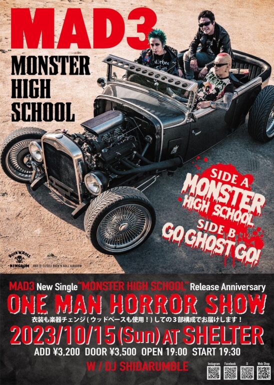 SCHEDULE 2023 10 15 Sunday MAD3 “MONSTER HIG SCHOOL”Release One Man Show OPEN 19:00 - START 19:30 Tweet MAD3 DJ:SHIDARUMBLE TICKETADV¥3200 / DOOR¥3500 【発売日】 8/21〜e+・BAND予約 Share