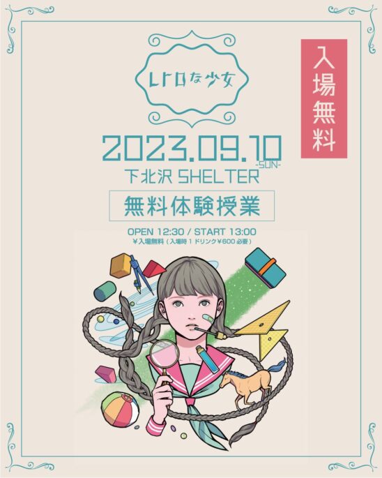 SCHEDULE 2023 09 10 Sunday DAY EVENT レトロな少女「無料体験授業」 OPEN 12:30 - START 13:00 Tweet レトロな少女 TICKETADV / DOOR¥無料(1ドリンク別) ※入場は当日先着順となります。定員になり次第終了。 Share