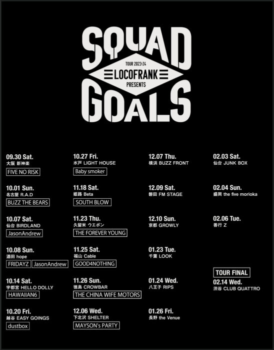 SCHEDULE 2023 12 06 Wednesday locofrank presents SQUAD GOALS TOUR OPEN 18:30 - START 19:00 Tweet locofrank MAYSON’s PARTY TICKETADV¥3800 / DOOR¥未定 【発売日】 THANK YOU!! SOLD OUT!! Share