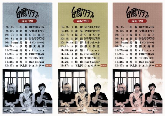 SCHEDULE 2023 12 17 Sunday 台風クラブ ツアー「遠足'23」 東京編 -追加単独公演- OPEN 18:00 - START 18:30 Tweet 台風クラブ TICKETADV¥3000 / DOOR¥3500 【発売日】 THANK YOU!! SOLDOUT!! Share