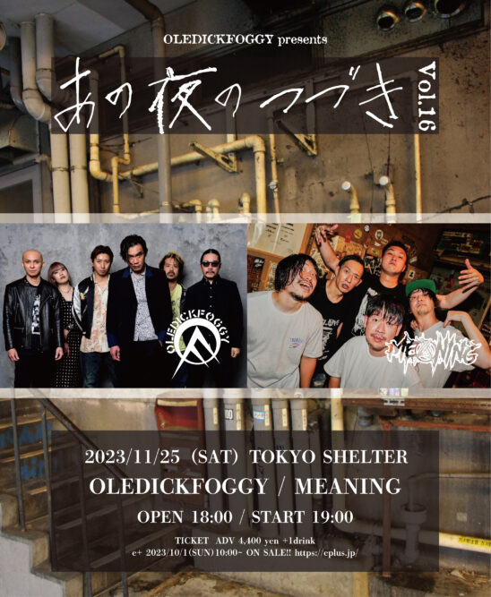 SCHEDULE 2023 11 25 Saturday OLEDICKFOGGY presents あの夜のつづき Vol.16 OPEN 18:00 - START 19:00 Tweet OLEDICKFOGGY MEANING TICKETADV¥4400 / DOOR¥未定 【発売日】 10/1〜e+・BAND予約 Share