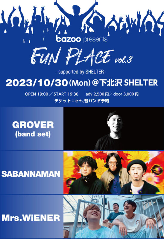 SCHEDULE 2023 10 30 Monday bazoo presents FUN PLACE ♯3 -supported by SHELTER- OPEN 19:00 - START 19:30 Tweet GROVER(band set) SABANNAMAN Mrs.WiENER TICKETADV¥2500 / DOOR¥3000 【発売日】 9/24〜e+ https://eplus.jp/sf/detail/3963560001-P0030001 Share