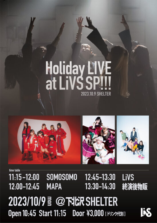 SCHEDULE 2023 10 09 Monday DAY EVENT Holiday LIVE at LiVS SP!!! OPEN 10:45 - START 11:15 Tweet LiVS MAPA SOMOSOMO TICKETDOOR¥3000 Share