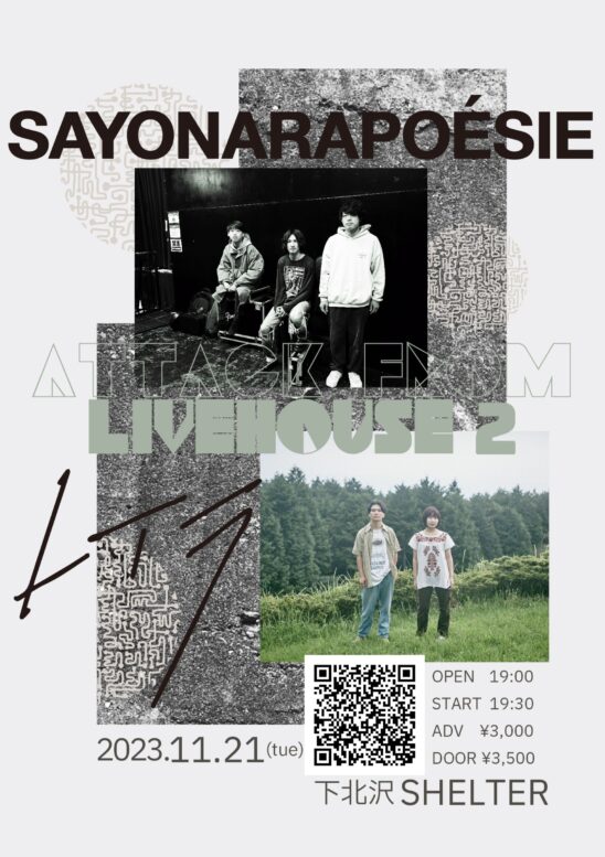 SCHEDULE 2023 11 21 Tuesday “ ATTACK FROM LIVEHOUSE 2 “ OPEN 19:00 - START 19:30 Tweet さよならポエジー レイラ TICKETADV¥3000 / DOOR¥3500 【発売日】 9/30〜e+ https://eplus.jp/sf/detail/3969370001-P0030001 Share