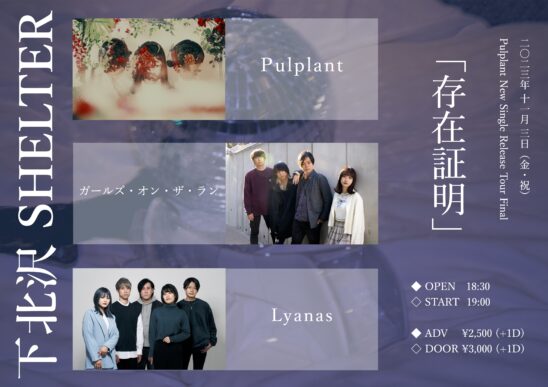 SCHEDULE 2023 11 03 Friday Pulplant New Single Release Tour Final 「存在証明」 OPEN 18:30 - START 19:00 Tweet Pulplant Lyanas ガールズ・オン・ザ・ラン TICKETADV¥2500 / DOOR¥3000 【発売日】 TIGET・各BAND予約 ※整列順となります。 Share