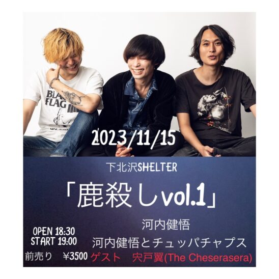SCHEDULE 2023 11 15 Wednesday 「鹿殺しvol.1」 OPEN 18:30 - START 19:00 Tweet 河内健悟 河内健悟とチュッパチャプス 宍戸翼(The Cheserasera) TICKETADV¥3500 / DOOR¥4000 【発売日】 10/7〜e+ https://eplus.jp/sf/detail/3973900001-P0030001 Share
