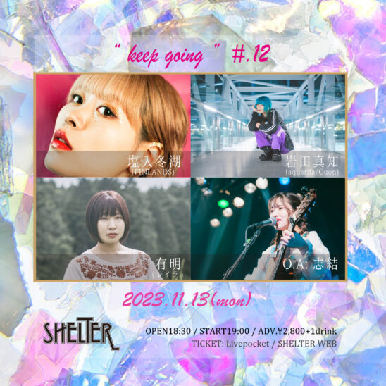 SCHEDULE 2023 11 13 Monday SHELTER presents.”keep going” #.12 OPEN 18:30 - START 19:00 Tweet 塩入冬湖(FINLANDS) 有明(レイラ) 岩田真知(aquarifa/Cuon) OA:志結 TICKETADV¥2800 / DOOR¥3300 【発売日】 10/13〜Livepocket・SHELTER WEB予約 https://t.livepocket.jp/e/byayg ※ご入場はLivepocketからになります。 Share このイベントの予約は締めきりました。