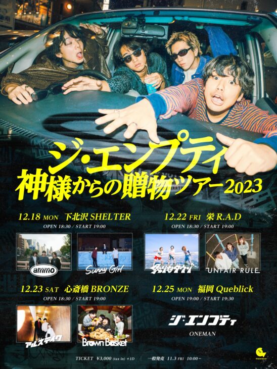SCHEDULE 2023 12 18 Monday 神様からの贈物ツアー 2023 OPEN 18:30 - START 19:00 Tweet ジ・エンプティ ammo Sunny Girl TICKETTHANK YOU! SOLD OUT!! ADV¥3000 【発売日】 11/3〜チケットぴあ https://w.pia.jp/t/the-empty/ Share