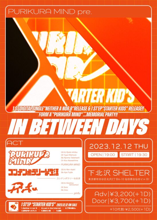 SCHEDULE 2023 12 12 Tuesday PURIKURA MIND pre IN BETWEEN DAYS OPEN 19:00 - START 19:30 Tweet PURIKURA MIND コンテンポラリーな生活 pinfu TICKETADV¥3200 / DOOR¥3700 / 10代割¥2500(+1D) 【発売日】 THANK YOU!! SOLD OUT!! Share