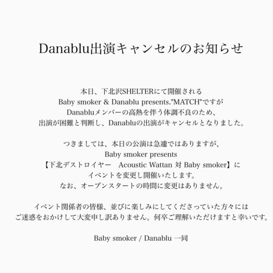SCHEDULE 2023 12 07 Thursday 【内容変更】Baby smoker presents “下北デストロイヤー Acoustic Wattan対Baby smoker” OPEN 18:30 - START 19:00 Tweet Baby smoker Acoustic Wattan ※Danablu出演キャンセルとなりました。 TICKETADV¥3300 / DOOR¥3800 【発売日】 各BAND予約 Share