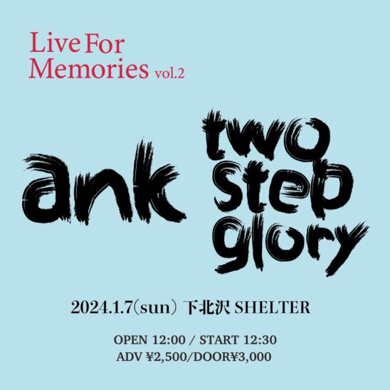 SCHEDULE 2024 01 07 Sunday DAY EVENT ank pre. Live For Memories vol.2 OPEN 12:00 - START 12:30 Tweet ank two step glory TICKETADV¥2500 / DOOR¥3000 【発売日】 各BAND予約 Share