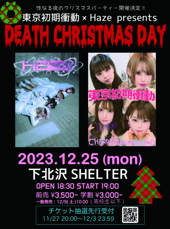 SCHEDULE 2023 12 25 Monday 東京初期衝動 x Haze presents 「DEATH CHRISTMAS DAY」 OPEN 18:30 - START 19:00 Tweet 東京初期衝動 Haze TICKETADV¥3500 / 学割※¥3000 【発売日】 チケットぴあ https://w.pia.jp/t/death-cli/ ※高校生以下。学割入場時に顔写真付身分証持参 Share