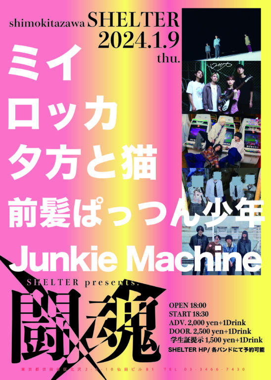 SCHEDULE 2024 01 09 Tuesday SHELTER presents. 闘魂 OPEN 18:00 - START 18:30 Tweet ミイ ロッカ 夕方と猫 前髪ぱっつん少年 Junkie Machine TICKETADV¥2000 / DOOR¥2500 / 学生¥1500 【発売日】 SHELTER WEB予約・各バンド予約(入場は整列順となります) Share このイベントの予約は締めきりました。