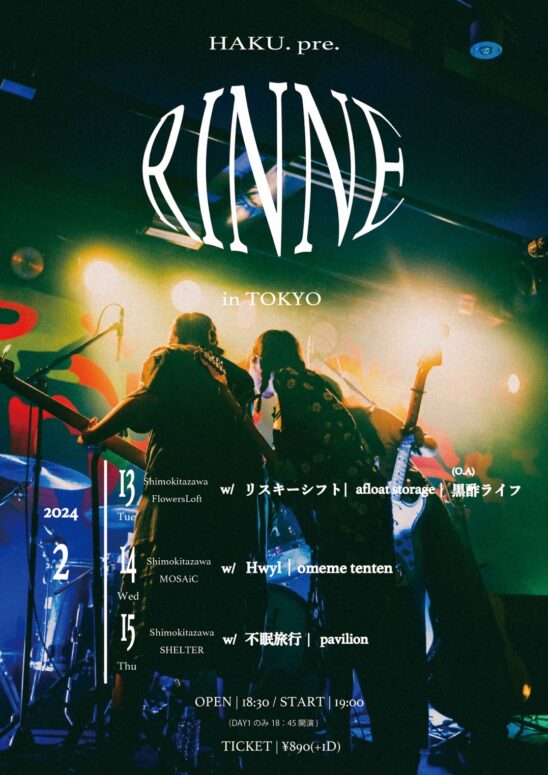 SCHEDULE 2024 02 15 Thursday ハク。pre.『RINNE 』DAY3 OPEN 18:30 - START 19:00 Tweet ハク。 不眠旅行 pavilion TICKETADV¥890 【発売日】 12/14〜e+ https://eplus.jp/sf/detail/4012300001-P0030001 Share