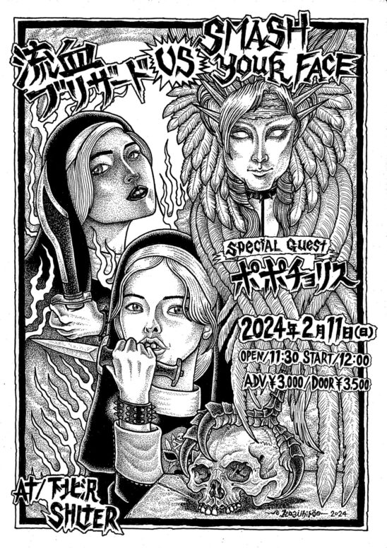 SCHEDULE 2024 02 11 Sunday DAY EVENT 流血ブリザード vs. SMASH YOUR FACE OPEN 11:30 - START 12:00 Tweet 流血ブリザード SMASH YOUR FACE SPECIAL GUEST:ポポチョリス TICKETADV¥3000 / DOOR¥3500 /10代・学割¥1500(※受付で証明できる物をご提示下さい。) 【発売日】 SHELTER予約 Share このイベントの予約は締めきりました。
